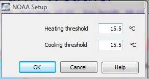 The thresholds for Heat and Cold Degree days are set in the NOAA Setup option within the Configuration menu. The picture shows just parts of the setup screen.